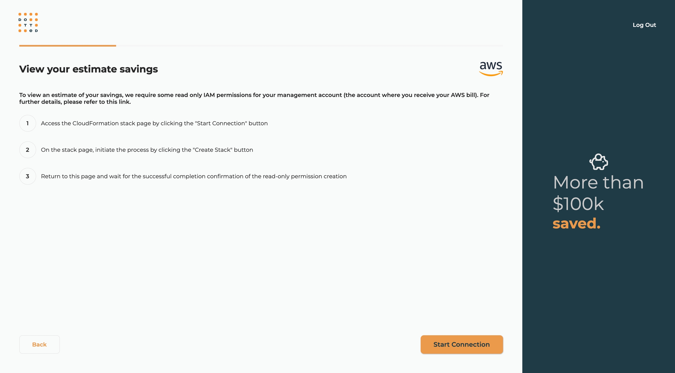 Get ready to embark on an exciting journey with Dotted! Our platform allows you to automate your savings effortlessly, eliminating the need for any engineering effort or financial risk on your part. Our advanced AI takes care of the heavy lifting – planning, purchasing, and selling AWS commitments, adapting to real-time fluctuations in your AWS usage. To kickstart this seamless process, we invite you to connect your AWS account to Dotted as the initial step.
