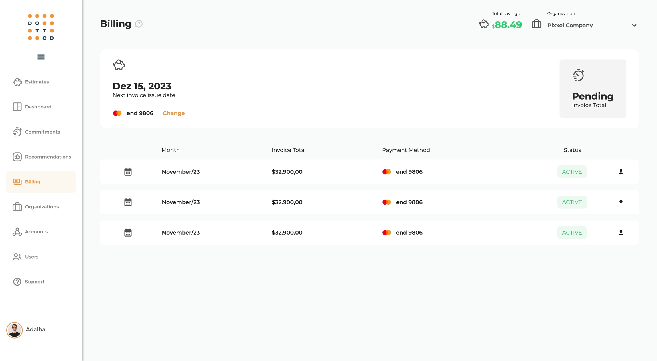 As Dotted handles your invoices, the same invoice would be posted on our platform - in the Invoices tab during the first week of each month. Please note that these invoices reflect the charges from AWS; Dotted does not mark up or add any additional fees to your usage costs. Additionally, you will see a line item called 'Dotted Savings' which reflects the amount that Dotted has saved you.