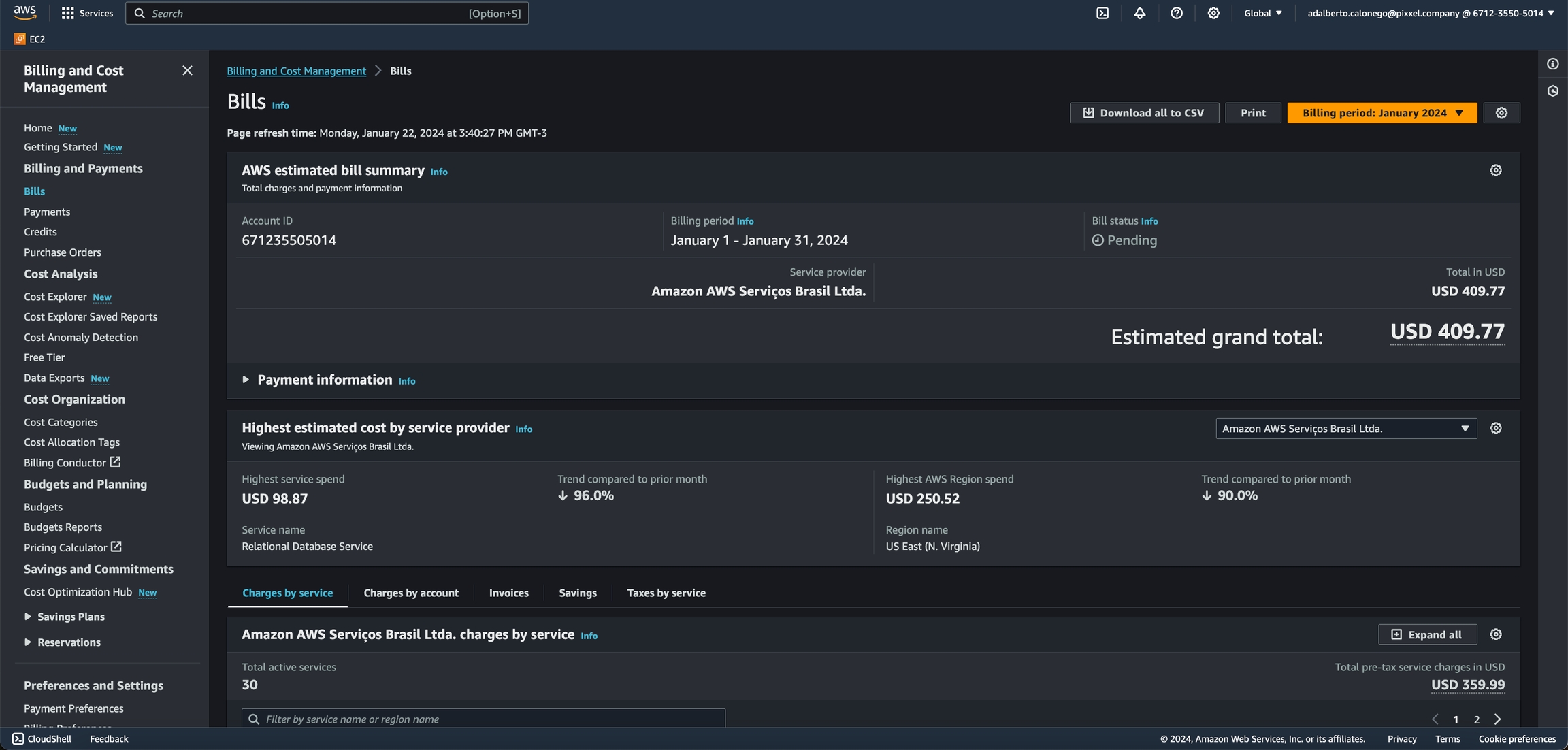 Your AWS invoices can be accessed from your AWS management console on the billing dashboard. From your AWS management account, head over to Billing Dashboard > Bills. The charges will be on the 'Charges by Services' Tab and the Dotted Savings will be on the 'Savings' Tab.
